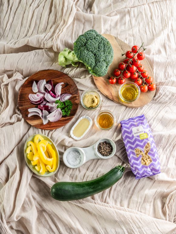Alles in eine große Schüssel geben, mit der Vinaigrette vermischen. Nach Wunsch mit frischer Petersilie garnieren und servieren.