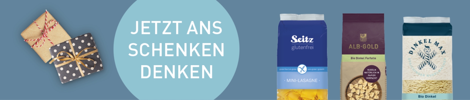 Wenn du die ALB-GOLD Spezialitäten nicht nur selbst genießen, sondern auch verschenken willst, dann sind unsere kulinarischen Geschenke genau das richtige für dich. Für jeden Geschmack stellen wir dir edle Feinkost Geschenkkörbe und raffinierte Nudelgeschenke zusammen. Speziell zusammengestellte Firmengeschenke für Mitarbeiter und Kunden führen wir ebenfalls im Angebot.